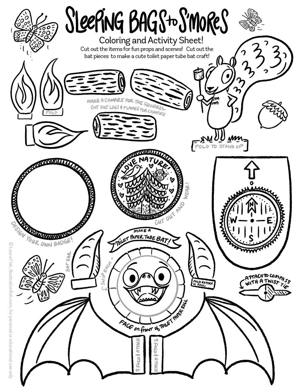 An activity sheet to go along with the camping how to book "Sleeping Bags to S'mores" written by Heather Balogh Rochfort and William Rochfort, and illustrated by me! :) Cut out everything on the sheet for a woodsy fun and a toilet paper tube bat!